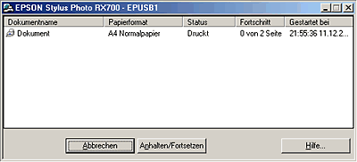 Der EPSON Spool Manager ähnelt dem Windows Druck-Manager. Gehen mehrere Druckaufträge gleichzeitig ein, werden sie aneinander gereiht (bei Netzwerkdruckern wird dies als Druck-Warteschlange bezeichnet). Erreicht ein Druckauftrag den Anfang der Warteschlange, wird er vom EPSON Spool Manager zu diesem Gerät übertragen. Der Spool Manager kann Statusinformationen zu den Druckaufträgen, die Sie an dieses Gerät abgeschickt haben, anzeigen. Außerdem können Sie ausgewählte Druckaufträge löschen, anhalten und fortsetzen.