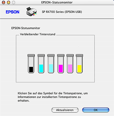 Sie können dieses Utility auch verwenden, um den Tintenstand vor dem Drucken zu überprüfen. EPSON Status Monitor zeigt den Status der verbleibenden Tintenmenge zum Zeitpunkt des Öffnens an. Um die Tintenstandinformationen zu aktualisieren, klicken Sie auf Aktualisieren.