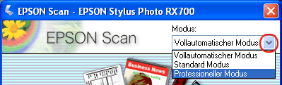 EPSON Scan verfügt über drei Modi zum Ändern von Scaneinstellungen: vollautomatischer Modus, Standard-Modus und professioneller Modus.