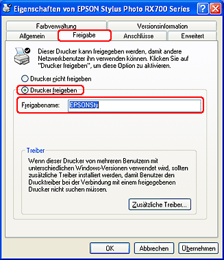 Zunächst müssen Sie dieses Gerät auf dem Computer, an den es direkt angeschlossen ist, als freigegebenen Drucker einstellen. Installieren Sie dann auf jedem Computer, der über das Netzwerk auf den Drucker zugreifen soll, die Druckersoftware.
