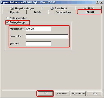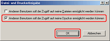 Aktivieren Sie das Kontrollkästchen Anderen Benutzern soll der Zugriff auf meine Drucker ermöglicht werden können, und klicken Sie anschließend auf OK.