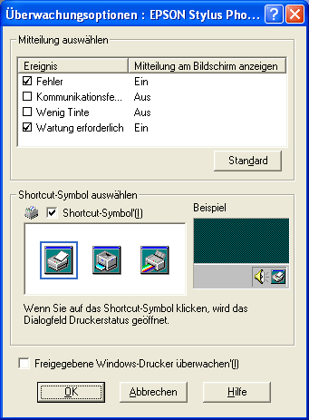 Markieren Sie das Kontrollkästchen Shortcut-Symbol, um ein Verknüpfungssymbol in der Windows-Taskleiste zu platzieren. Wenn Sie auf das Verknüpfungssymbol in der Symbolleiste klicken, öffnet sich der EPSON StatusMonitor 3. Wenn Sie auf das Symbol mit der rechten Maustaste klicken, rufen Sie einige der Drucker-Utilitys auf. |