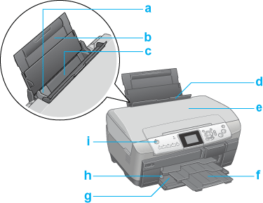 g. Vordere Papierfach: Aus dem Einzelblatteinzug kann ein Stapel Papier automatisch eingezogen werden.