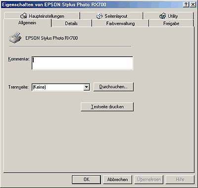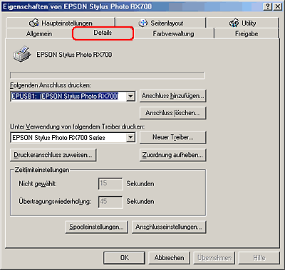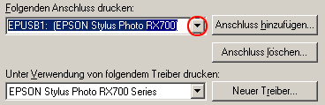 Wenn EPUSBX: (EPSON Stylus Photo RX700) im Listenfeld An folgendem Anschluss drucken angezeigt wird, sind der USB-Gerätetreiber und der Druckertreiber richtig installiert. Wenn der korrekte Anschluss nicht angezeigt wird, fahren Sie mit dem nächsten Schritt fort.