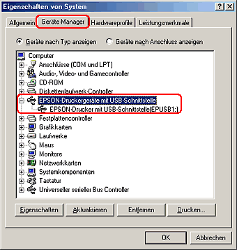 Wenn die Treiber korrekt installiert sind, erscheint die Option EPSON USB-Drucker auf der Registerkarte Geräte-Manager.