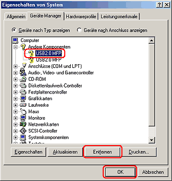 Unter Andere Komponenten wählen Sie USB 2.0 MFP oder EPSON Stylus Photo RX700 aus und klicken Sie auf Entfernen. Klicken Sie dann auf OK.