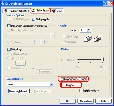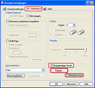 Der tatsächliche Bindungsrand kann abhängig von der Anwendung von den vorgegebenen Einstellungen abweichen. Drucken Sie einige Testseiten aus, bevor Sie den gesamten Druckauftrag starten.