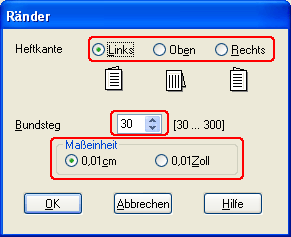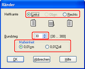 Wählen Sie cm oder Zoll als Einstellung für Maßeinheit aus. Legen Sie dann die Breite des Bindungsrands fest. Sie können eine beliebige Breite zwischen 0,3 und 3,0 cm bzw. 0,12 und 1,18 Zoll eingeben.