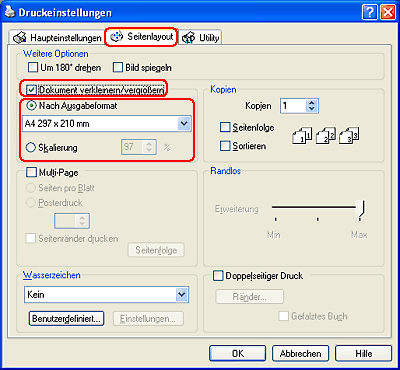 Wählen Sie die Papiergröße der Datei als Einstellung für Größe aus. Sie können auch ein eigenes Papierformat definieren. Nähere Informationen dazu erhalten Sie im folgenden Abschnitt.