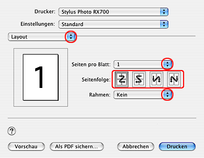 Hier können Sie die Reihenfolge festlegen, in der die Seiten auf das Einzelblatt gedruckt werden.
