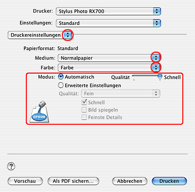 Nehmen Sie die erforderlichen Einstellungen für Medium, Farbe und Modus vor. Nähere Informationen zu den Druckeinstellungen finden Sie in der Online-Hilfe.