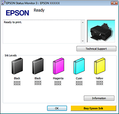 Μπορείτε να αποκτήσετε πρόσβαση στις Οδηγίες χρήστη από την εφαρμογή EPSON Status Monitor 3. Αν αντιμετωπίσετε πρόβλημα, κάντε κλικ στην επιλογή Technical Support (Τεχνική υποστήριξη) στο παράθυρο EPSON Status Monitor 3. Για Mac OS XΧρήση του EPSON StatusMonitor.Αν η εφαρμογή EPSON StatusMonitor ανιχνεύσει κάποιο πρόβλημα στον εκτυπωτή, θα σας ενημερώσει με μήνυμα σφάλματος.