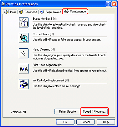 Μπορείτε να αυξήσετε την ταχύτητα εκτύπωσης επιλέγοντας ορισμένες ρυθμίσεις στο παράθυρο Speed & Progress (Ταχύτητα & πρόοδος). Κάντε κλικ στο κουμπί Speed & Progress (Ταχύτητα & πρόοδος) στο παράθυρο’ Maintenance (Συντήρηση) του προγράμματος οδήγησης του εκτυπωτή σας.