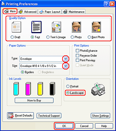Επιλέξτε το κατάλληλο μέγεθος φακέλου από τις επιλογές της ρύθμισης Paper Size (Μέγεθος χαρτιού). Μπορείτε επίσης να ορίσετε προσαρμοσμένο μέγεθος φακέλου. Για λεπτομέρειες, ανατρέξτε στην ηλεκτρονική βοήθεια.