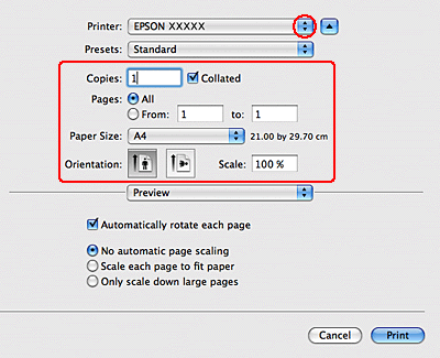 Επιλέξτε τον εκτυπωτή που χρησιμοποιείτε στη ρύθμιση Printer (Εκτυπωτής). Στη συνέχεια, επιλέξτε τις ρυθμίσεις Copies & Pages (Αντίγραφα και σελίδες).