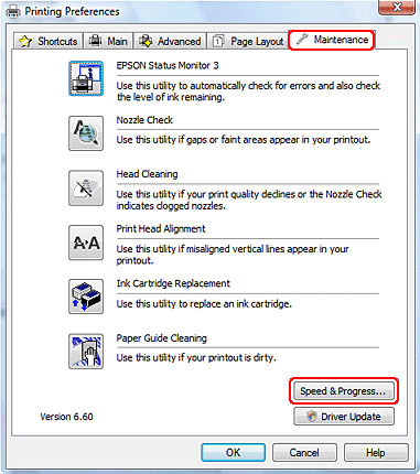 Μπορείτε να αυξήσετε την ταχύτητα εκτύπωσης, επιλέγοντας ορισμένες ρυθμίσεις στο παράθυρο Speed & Progress (Ταχύτητα πρόοδος). Κάντε κλικ στο κουμπί Speed & Progress (Ταχύτητα πρόοδος) στο παράθυρο Maintenance (Συντήρηση) του προγράμματος οδήγησης του εκτυπωτή σας.