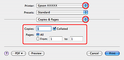 Επιλέξτε τον εκτυπωτή που χρησιμοποιείτε στη ρύθμιση Printer (Εκτυπωτής) και, στη συνέχεια, επιλέξτε τις ρυθμίσεις στο στοιχείο Copies & Pages (Αντίγραφα και σελίδες).