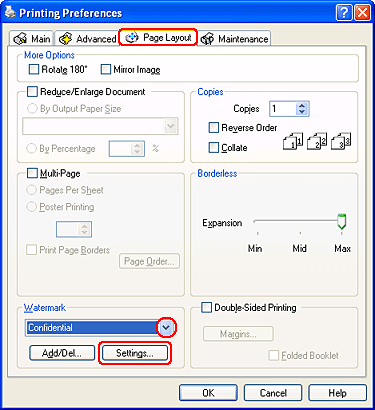 Κάντε κλικ στο Add/Del (Προσθήκη/Διαγραφή) στην επιλογή Watermark (Υδατογράφημα) στο παράθυρο Page Layout (Διάταξη σελίδας). Εμφανίζεται το παρακάτω παράθυρο.