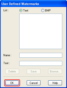 Για να χρησιμοποιήσετε ένα αρχείο εικόνας ως υδατογράφημα, επιλέξτε BMP. Κάντε κλικ στο Browse (Αναζήτηση) για να εντοπίσετε το αρχείο bitmap που θέλετε να χρησιμοποιήσετε και, στη συνέχεια, πατήστε OK. Πληκτρολογήστε ένα όνομα για το υδατογράφημά σας στο πλαίσιο κειμένου Name (Όνομα) και, στη συνέχεια, κάντε κλικ στο Save (Αποθήκευση).