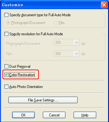 Full Auto Mode (Πλήρης αυτοματοποίηση): Κάντε κλικ στο κουμπί Customize (Προσαρμογή). Κατόπιν, επιλέξτε το πλαίσιο ελέγχου Color Restoration (Επαναφορά χρωμάτων) και κάντε κλικ στο OK. Συνεχίστε στο βήμα 9.
