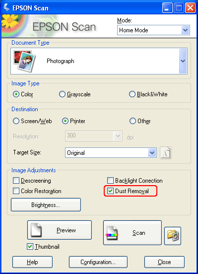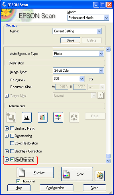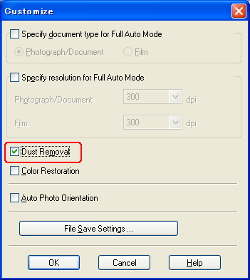 Αφαίρεση σκόνηςΧρησιμοποιώντας τη λειτουργία Dust Removal (Αφαίρεση σκόνης) του Epson Scan, μπορείτε στην ουσία να “καθαρίσετε” τα σημάδια σκόνης από τα πρωτότυπα κατά τη σάρωση.
