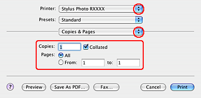 Επιλέξτε τον εκτυπωτή που χρησιμοποιείτε για τη ρύθμιση Printer (Εκτυπωτής) και, στη συνέχεια, πραγματοποιήστε τις ρυθμίσεις Copies & Pages (Αντίγραφα και σελίδες).