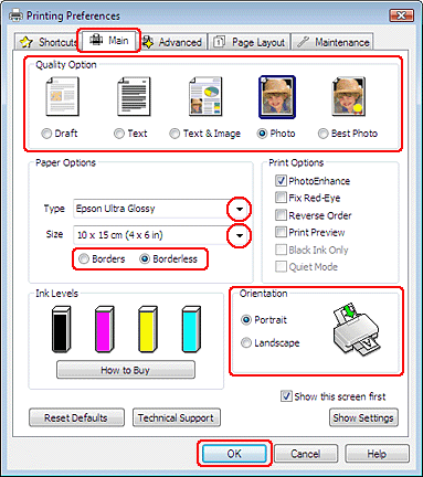 Κάντε κλικ στην καρτέλα Main (Κύριο) και έπειτα επιλέξτε μια από τις ακόλουθες ρυθμίσεις Quality Option (Τύπος ποιότητας):
