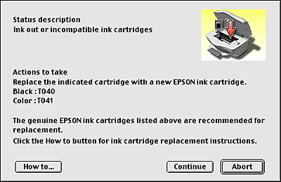 When the ink runs low or out, a How to button appears below the text box. Click How To and EPSON Status Monitor 3 will lead you step-by-step through the cartridge replacement procedure.