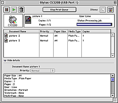 After you send a print job to this product, you can use the EPSON Monitor IV utility to check, cancel, or change the priority of print jobs that are queued for printing. This utility also shows the status of the job currently being printed.