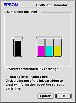 You can also use this utility to check ink levels before printing. When open, EPSON StatusMonitor displays the amount of ink remaining at the time it was opened. To update the ink level information, click the Update button.
