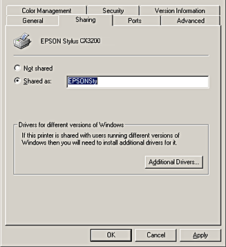 If you want Windows XP or 2000 to automatically download printer drivers to computers that are running different versions of Windows, click Additional Drivers and select the environment and the operating systems for the other computers. Click OK, then insert the printer software CD into the CD-ROM drive. Select WIN9X for Windows Me or 98. Click OK to install the additional drivers.