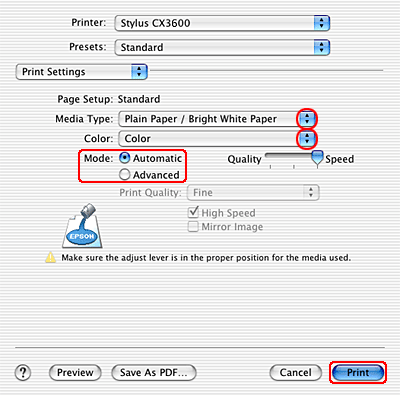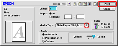 Make the appropriate Media Type, Color, and Mode settings. See online help for details.