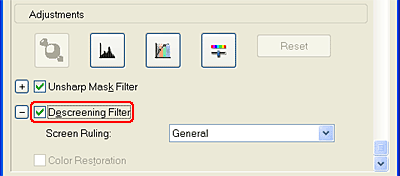 Select the Descreening Filter check box in the Adjustments section. In Home Mode, open the Image Adjustments dialog box first to get to the Descreening Filter check box.