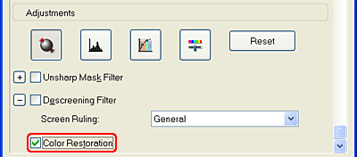 Color Restoration is a scanner software feature that restores faded color on photos. Select the Color Restoration check box to restore color in the Home Mode or Professional Mode.
