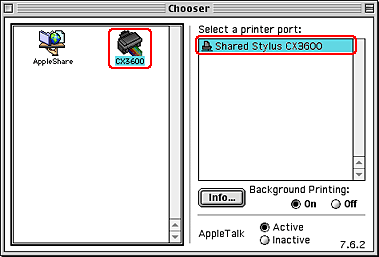 Choose Chooser from the Apple menu. Click an icon for this product and select the printer port that you want to use from the Select a printer port list.
