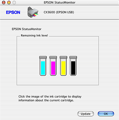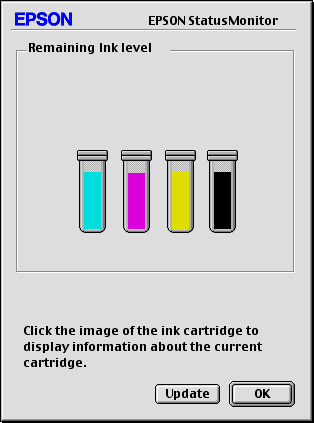 The graphic displays the amount of ink that was remaining when EPSON StatusMonitor was first opened. To update the ink-level information, click Update.