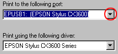 If EPUSBX: (EPSON Stylus CX3600) is displayed in the Print to the following port list box, then the USB printer device driver and printer software is installed correctly. If the correct port is not displayed, proceed to the next step.