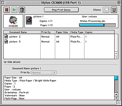 After you send a print job, an EPSON Stylus CX3600 Series button appears on the taskbar. Click this button to open the EPSON Spool Manager.