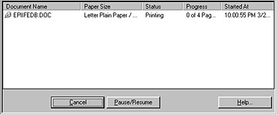 EPSON Spool Manager is similar to Windows Print Manager. If it receives two or more print jobs at one time, it holds them in the order that they were received (with printers on a network this may be called a print queue). When a print job reaches the top of the line, the EPSON Spool Manager sends the job to the printer. From the Spool Manager, you can cancel print jobs. You can also view print status information about the print jobs which have been sent to this product, as well as pause and resume selected print jobs.