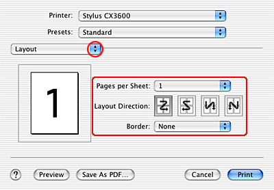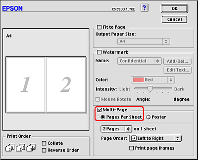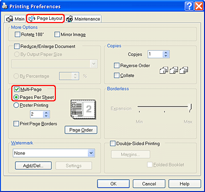 ![]() | Click the Page Layout tab and select the Multi Page check box. Then, select Pages Per Sheet. |