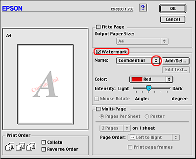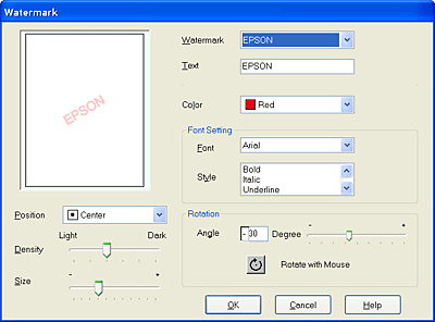 ![]() | Make sure that the appropriate watermark is selected in the Watermark list, then make Color, Position, Density, Size, Font, Font Style, and Angle settings. For details, see online help. Your settings are reflected in the display at the left side of the dialog box. |