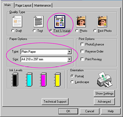 Click the Main tab, and then select Plain Paper and A4 as the Paper Options settings, and Text & Images as the Quality Type setting.