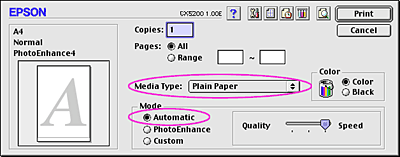 Select Plain Paper as the Media Type setting, and Automatic as the Mode setting.