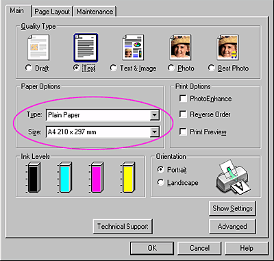 ![]() | For Windows, select the desired Size and Type settings under Paper Options on the Main menu. Then select Portrait (tall) or Landscape (wide) to change the orientation of your printout. |
