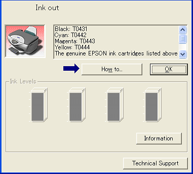 When the ink runs low or out, a How to button appears below the text box. Click How to, and EPSON Status Monitor 3 will lead you step-by-step through the cartridge replacement procedure.