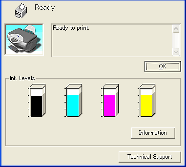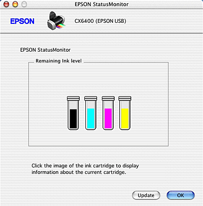 You can also use this utility to check ink levels before printing. When open, EPSON StatusMonitor displays the amount of ink remaining at the time it was opened. To update the ink level information, click Update.
