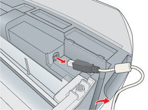 ![]() | Plug the connector of the USB cable (disconnected from this product earlier) into the USB port of this product, and then place its cable in the slot. |