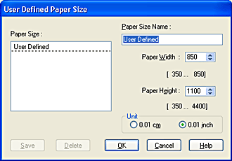 Select User Defined as the Size setting. The User Defined Paper Size dialog appears.