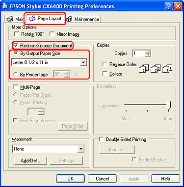 Click the Page Layout tab, then select the Reduce/Enlarge Document check box. You can select the following settings to change the size of your document.