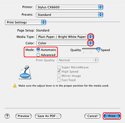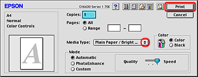 Make the appropriate Media Type, Color, and Mode settings. See online help for details. |